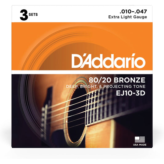 D'Addario EJ10-3D Bronze Acoustic Guitar Strings, Extra Light, 10-47, 3 Sets