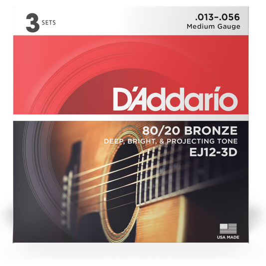 D'Addario EJ12-3D 80/12 Bronze Acoustic Guitar Strings, Medium, 13-56, 3 Sets