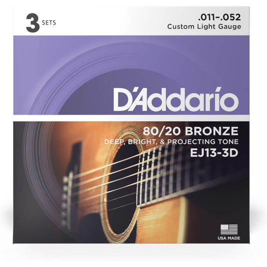D'Addario EJ13-3D 80/20 Bronze Acoustic Guitar Strings, Custom Light, 11-52, 3 Sets