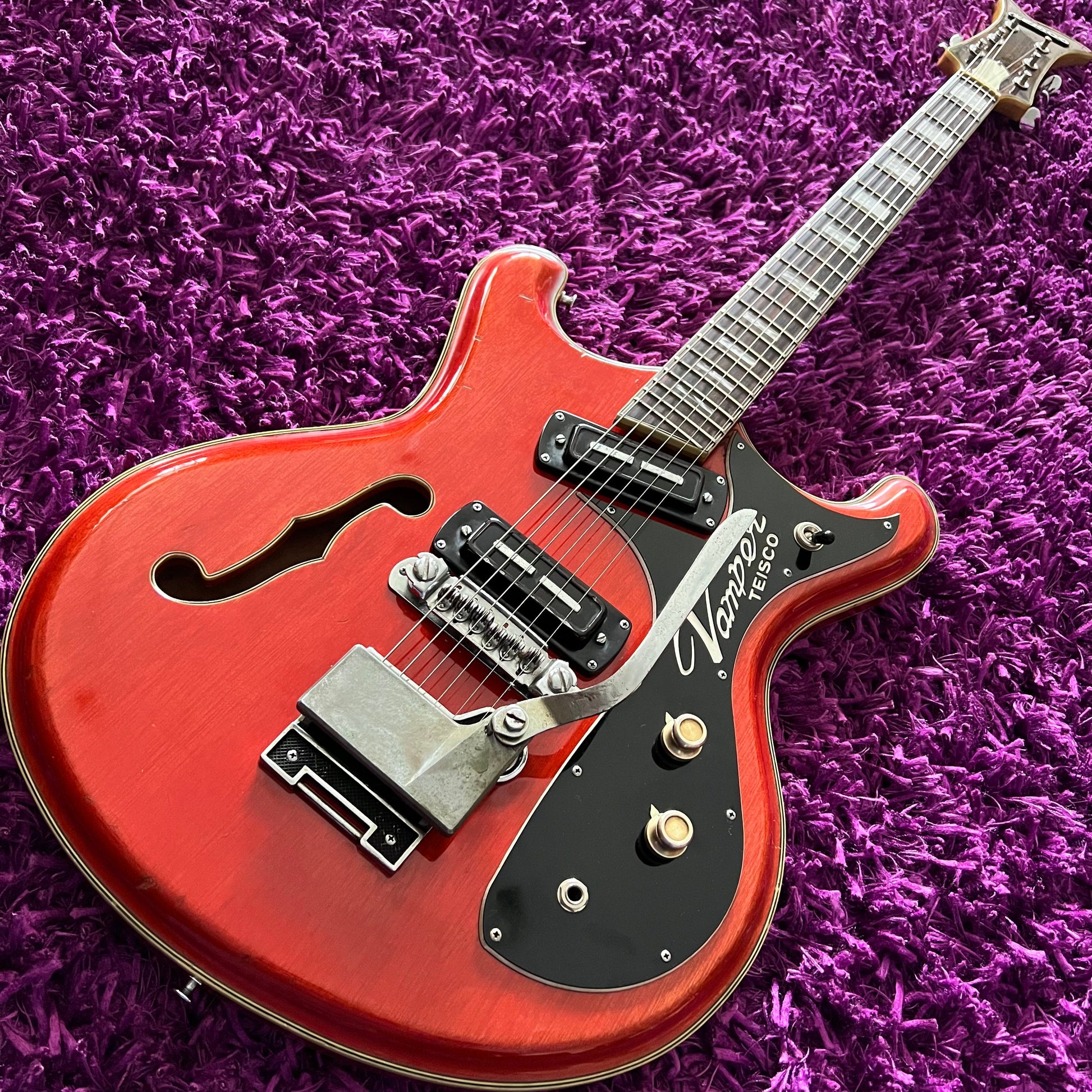 One of the most collectable and desirable of all the Teisco models, the Vamper was produced in small numbers by the most skilled of luthiers at Teisco right before the Kawai handover and are one of the coolest semi-hollow vintage guitars going round. This model features full binding on the front, back and F-hole, as well as binding on the neck with block inlays, and probably the coolest feature, a continuous rosewood veneer on the headstock that follows through to the fingerboard. This is an expertly crafted guitar and it really shows!