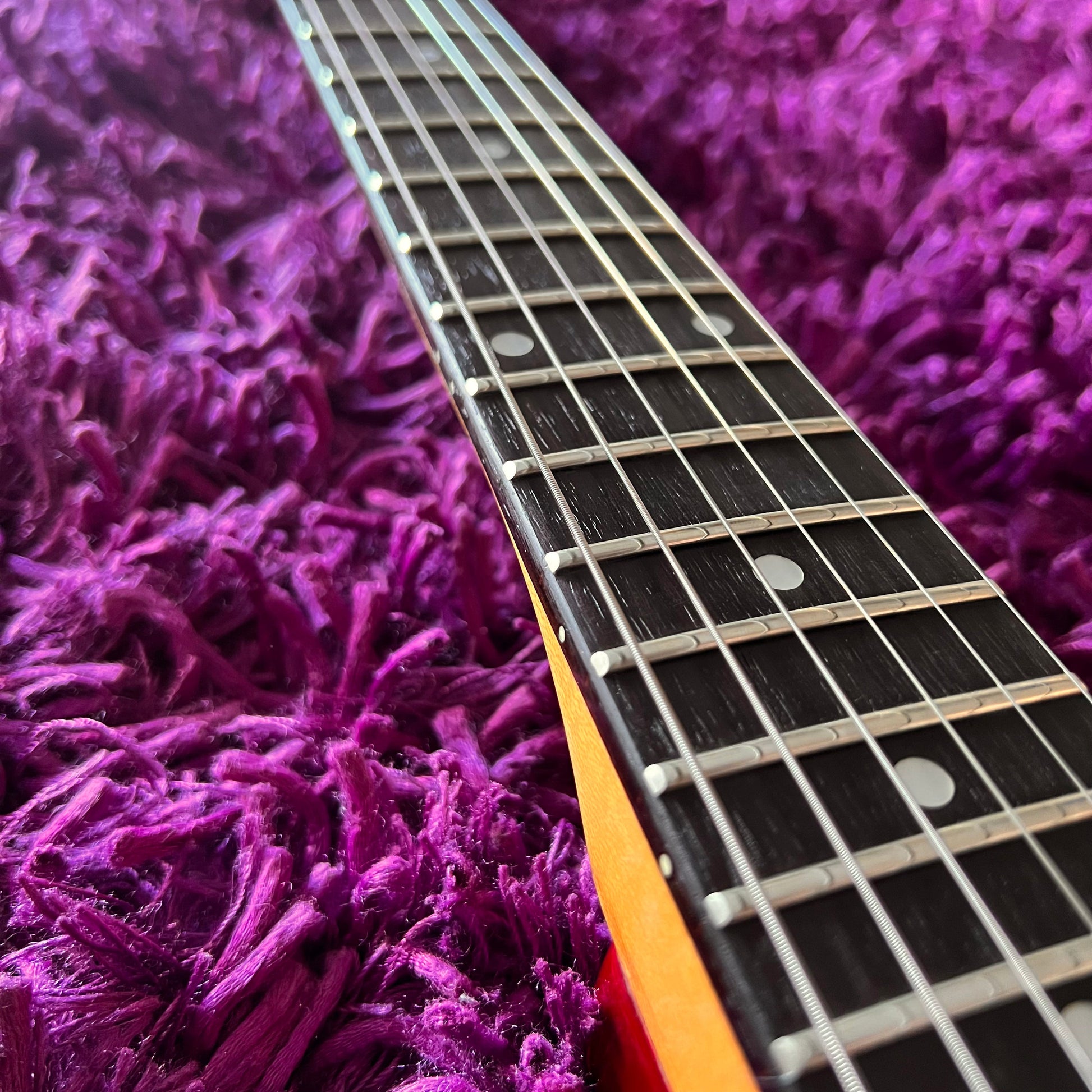 This one has had an aftermarket locking nut installed at some point for extra tuning stability and we've given it a full fret crown and dress to make it play like silk with a super low action. Coil split for the bridge humbucker via a mini-toggle for a wide range of tones. Comes with a non-original hard shell case!