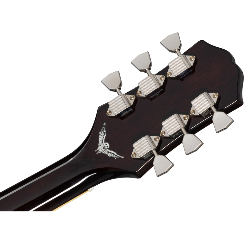 Jim James, the vocalist, producer, primary songwriter, and guitarist for My Morning Jacket, has long impressed fans worldwide with his band and his solo projects. He now has his very own Epiphone signature model. Based on one of his favorite guitars, the Epiphone Jim James ES-335 features a Seventies Walnut-finished 5-ply laminated maple body with a solid maple centre block for increased sustain and a mahogany neck with a Jim James Custom Slim Taper™ C profile and an Indian laurel fretboard with dot inlays. The Alnico Classic Pro pickups are paired with CTS® potentiometers and Orange Drop® capacitors. Personal touches include vintage-style Kluson® Waffleback tuners with metal buttons, a circle/arrow emblem on the truss rod cover, and an owl decal on the back of the headstock. A hard-shell case with an owl logo is also included.