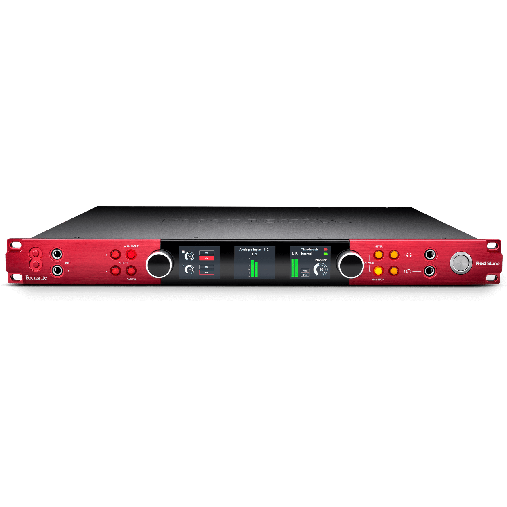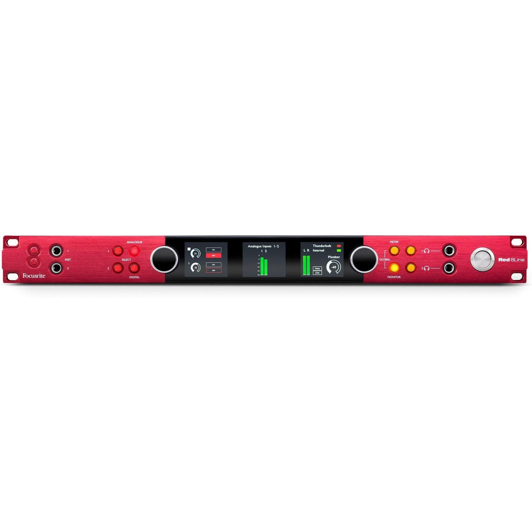 Other features of the Red 8Line include precision metering and display: the interface has three LCD displays for highly-accurate level metering for any input or output block, as well as main monitor and headphone outputs. Two discrete high-fidelity headphone outputs are powerful enough to deliver loud and clear audio on high-impedance headphones, and are controlled from the interface front panel. Dual instrument inputs on the front panel ensure you always have immediate access to quickly plug in a guitar, for example, even when racked.