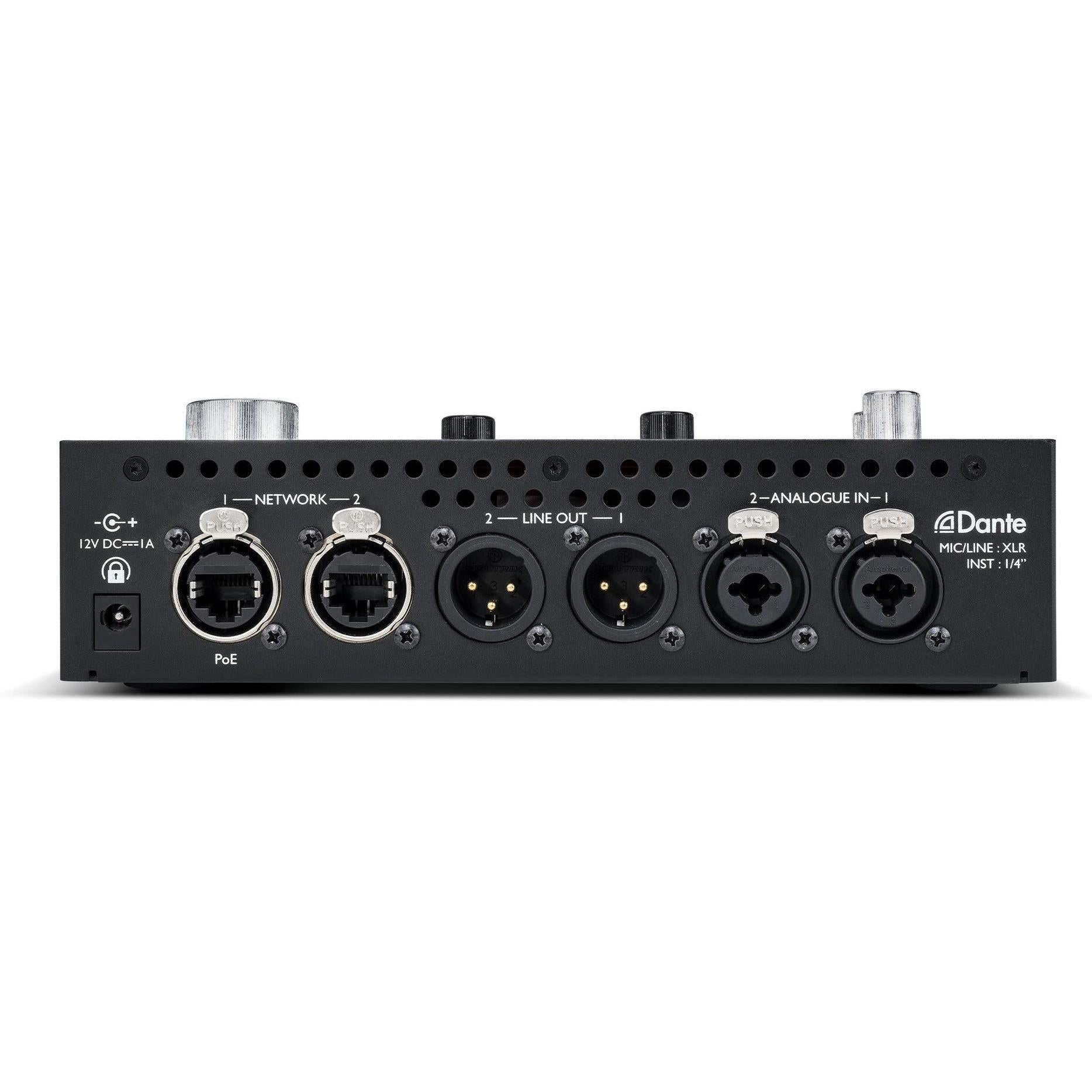 2x2 analogue I/O with 2x mic pres, headphone and line output, PoE supplied
