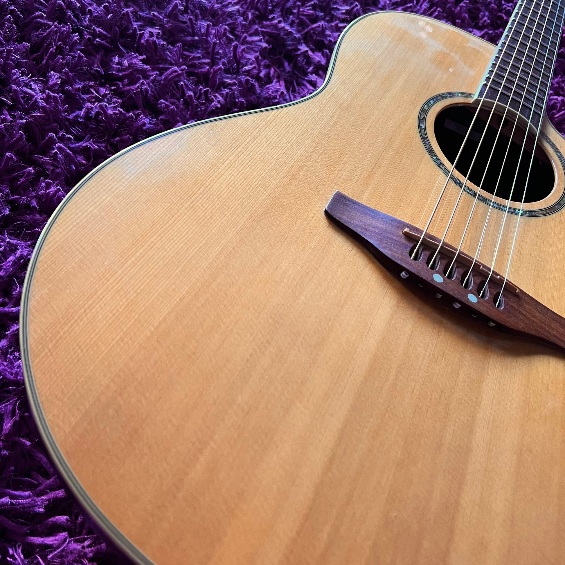 This stunning guitar is finished in a clear lacquer, natural finish to showcase the beauty of the top. The mid depth, Lyrachord® composite body is deep enough to offer warm low end, but shallow enough to play comfortably. Its unique shape projects sound differently than any other guitar.