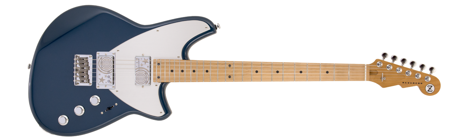 The Reverend Billy Corgan Drop Z combines the aesthetic features of his Z-One signature model and a longer 24-fret, 26.25″ scale neck designed for drop tunings. The long scale neck provides appropriate string tension for down-tuning, so the tone is deep and full, yet still stays punchy and clear. The Alder solid body paired with Railhammer Billy Corgan Z-One Pickups delivers a heightened output and a velvety treble for a rich, weighty rock tone. The roasted Maple neck, fingerboard, and medium oval profile are comfortable to play, even with the slightly longer scale length.